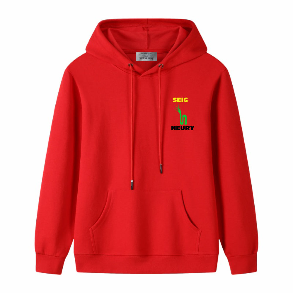 Sweat à capuche 100% coton, pour homme et femme. Coupe regular, capuche à lacet de serrage, logo SEIGNEURY imprimé. Confort naturel toutes saisons. Disponible en 9 coloris.